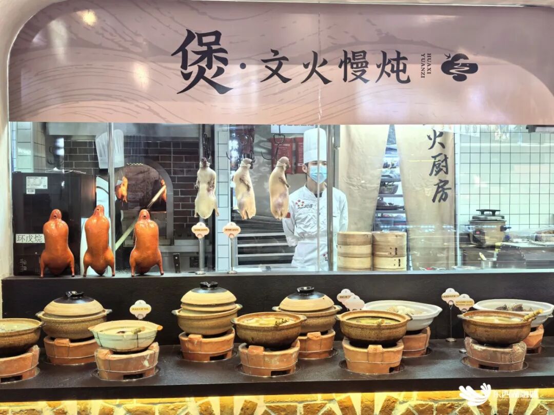 进入餐厅一楼大堂,河鲜、蔬菜、腊货在这里集中展示,仿佛一个大型菜市场。顾客现场看菜点菜,下单后食材直接拿到厨房制作。集市内还有煲汤、烧烤、凉拌、蒸菜等明档,隔着玻璃,顾客可以看到厨师的烹饪过程。