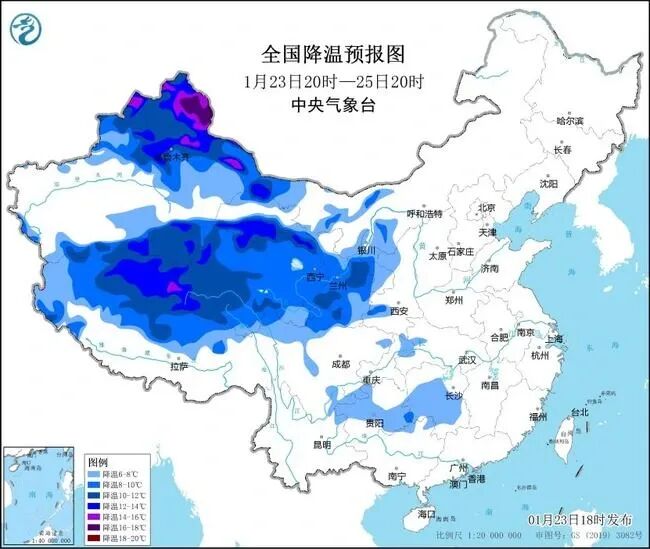 预计,1月23日20时至1月25日20时,新疆北部、西藏中北部、青海大部、甘肃大部、宁夏南部等地将先后降温8℃~10℃,其中,新疆北部、西藏北部、甘肃西部等地部分地区降温可达12℃以上。新疆北部、西北地区东部等地有5~7级风、阵风7~9级,西藏大部、青海中南部、川西高原等地有5~7级风、阵风8~10级。