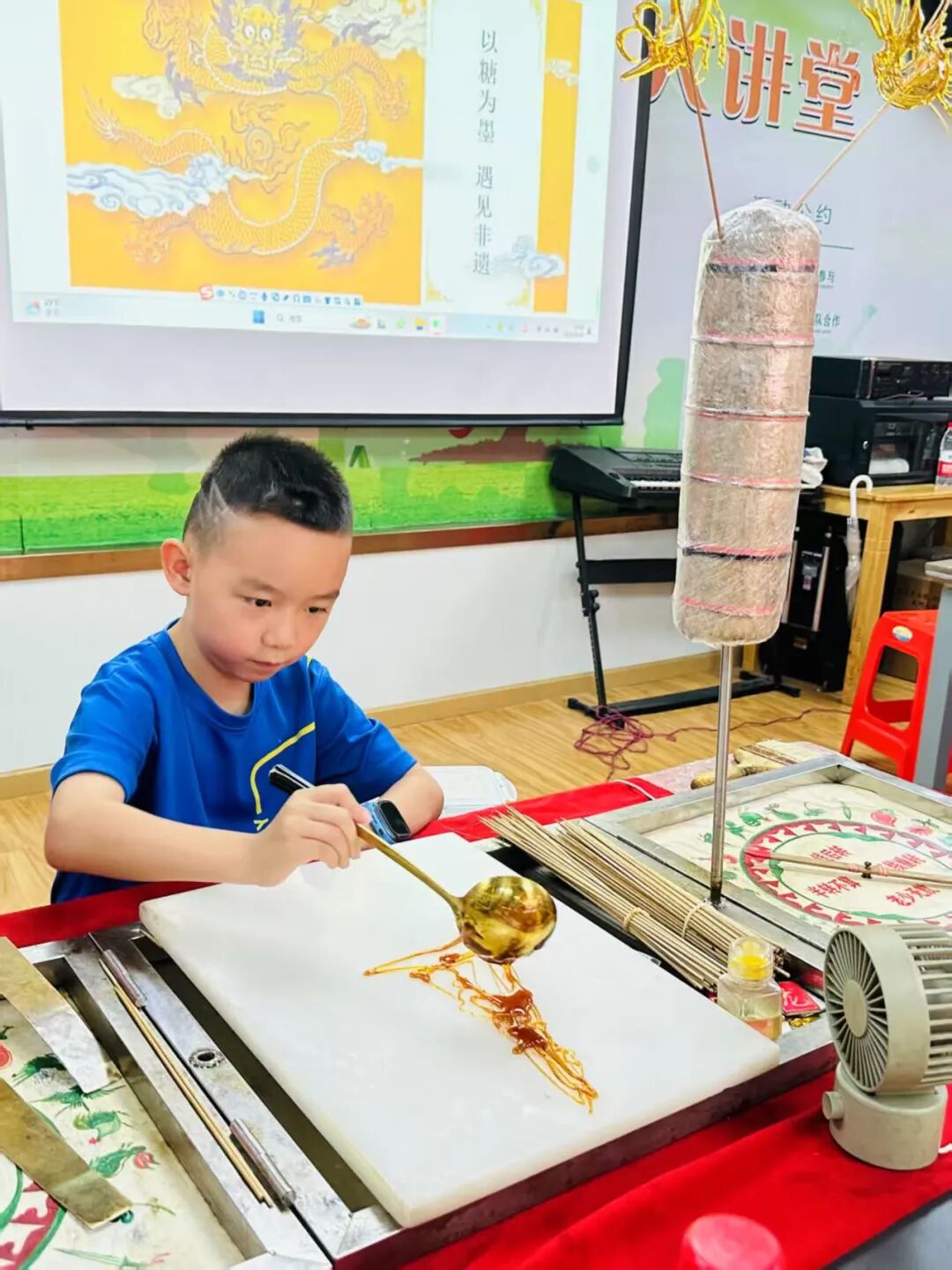 小朋友用糖浆认真绘制非遗糖画(社区供图)。