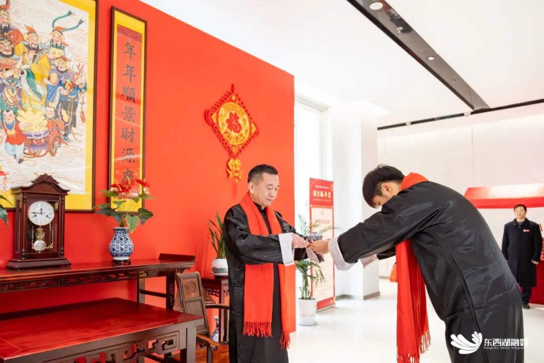 非遗传承大师与徒弟举行传统拜师仪式。