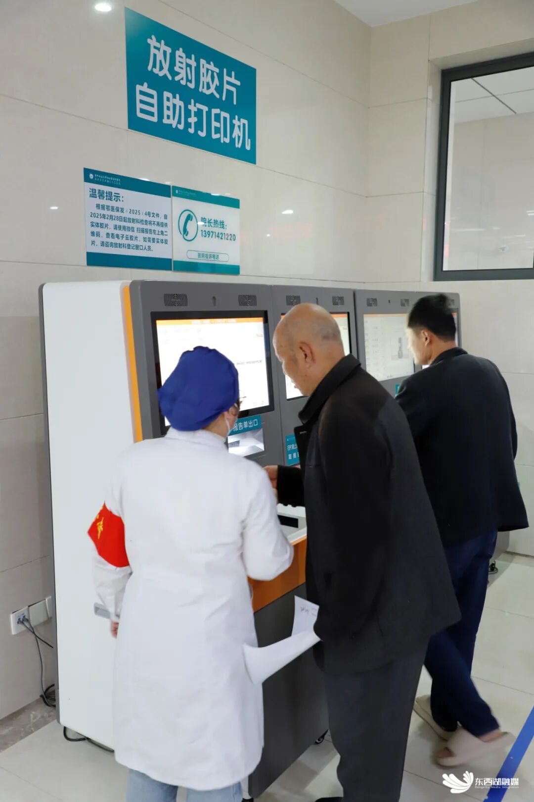 协和东西湖医院工作人员协助患者打印报告单。