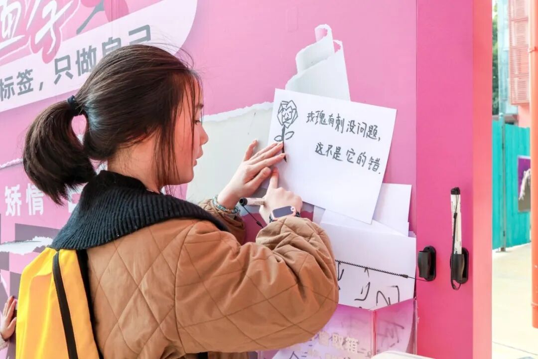 在粉色标签墙前,年轻女孩正用马克笔改写世俗剧本。“永远自由如风,永远为自己着迷。”“玫瑰有刺没问题,这不是它的错”,鼓励女性撕掉世俗偏见,勇敢做自己。