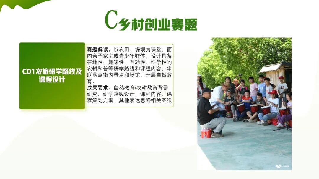 共15个赛题:C01农旅研学路线及课程设计、C02智慧养生民宿集群设计及运营策划、C03乡创潮玩——扎根乡村的青年潮玩体验式项目设计及运营策划、C04乡村餐饮——在地美食文化的创新表达与可持续经营设计、C05萌宠乡伴——宠物经济赋能乡村振兴创新计划、C06乡村智慧便利店创新设计与运营策划、C07乡村振兴我见证、C08美丽慈惠我宣传、C09“青春临空港”我运营、C10精准农芯,绿碳田园——助力智慧农业新农村、C11农作物种植和全产业链开发计划、C12 IP创意加工及新消费场景开发、C13“四季采摘”立体种植系统及体验经济开发、C14“幸福慈惠·草莓工坊”智慧农旅融合产业园升级计划、C15赛题盲盒(其余14个赛题未涉及的作品可参与C15赛题)