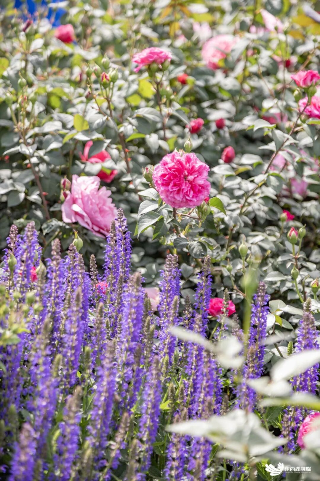 除了月季花,花园内还搭配种植了杜鹃、鸢尾、黄金菊、石竹花、络石花、林荫鼠尾草等数十种花卉植物,它们错落有致,与月季花相互映衬,共同构成了一幅绚丽多彩的春日画卷。