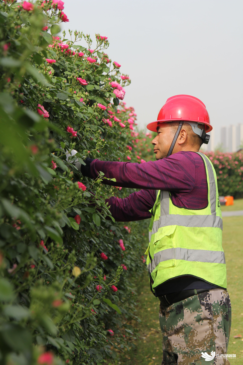 在一株株盛开的树桩月季前,月季花园养护工人朱龙武正在给它们“抹芽”,“就是将下层弱小的芽掐掉,让营养物质更好地向顶端供应。”朱龙武介绍,这项工作还可以打开内堂空间,使得花朵开得更饱满更艳丽。