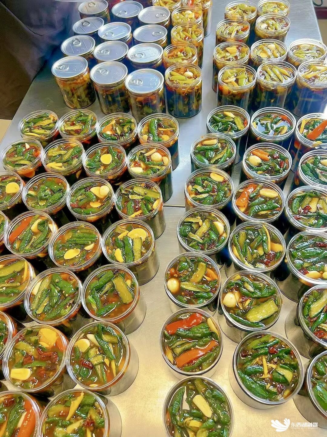 操作台上,翠绿透亮的黄瓜块,沉浸在琥珀色的卤汁里,红辣椒如宝石般点缀其间;刚腌制好的莴苣片、萝卜皮卷曲成诱人的弧度,泛着晶莹的光泽。各种蔬果食材,正在经历时光的沉淀。