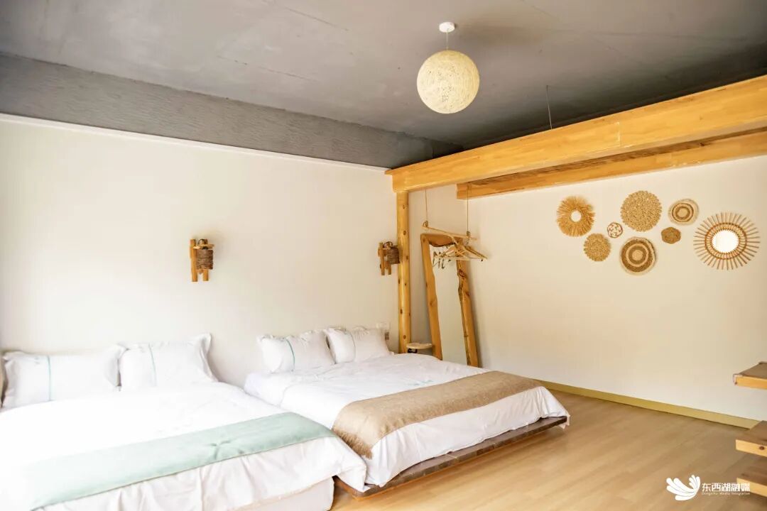 所有客房皆取意唐诗宋词:“竹影”取自释志璇“竹影扫阶尘不动,月穿潭底水无痕”动静相生的自然画卷,房间落地窗将田园风光作天然屏风;“晓暮”取自唐寅《一剪梅·雨打梨花深闭门》“晓看天色暮看云”的暮色诗境。