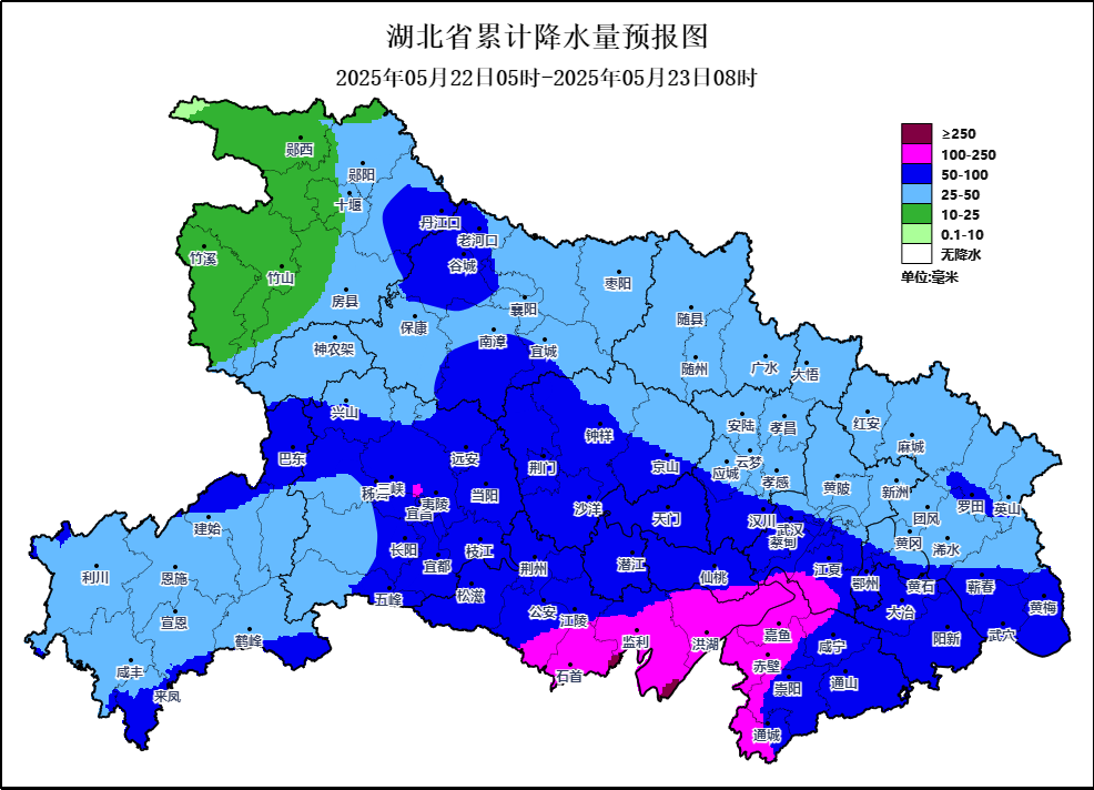 因水汽输送加强和低涡影响,预计22日我省将有大范围大雨到暴雨,并伴有短时强降水(最大雨强40~80毫米)、雷暴大风(8~11级)、冰雹等强对流天气,其中荆州、仙桃、武汉南部、咸宁局地大暴雨,单点特大暴雨;大部分地区累计雨量30~80毫米,江汉平原南部和鄂东南局地100~180毫米、单点220毫米以上。此次过程降雨强度大,且前期干旱少雨,旱涝急转风险大,致灾风险高。