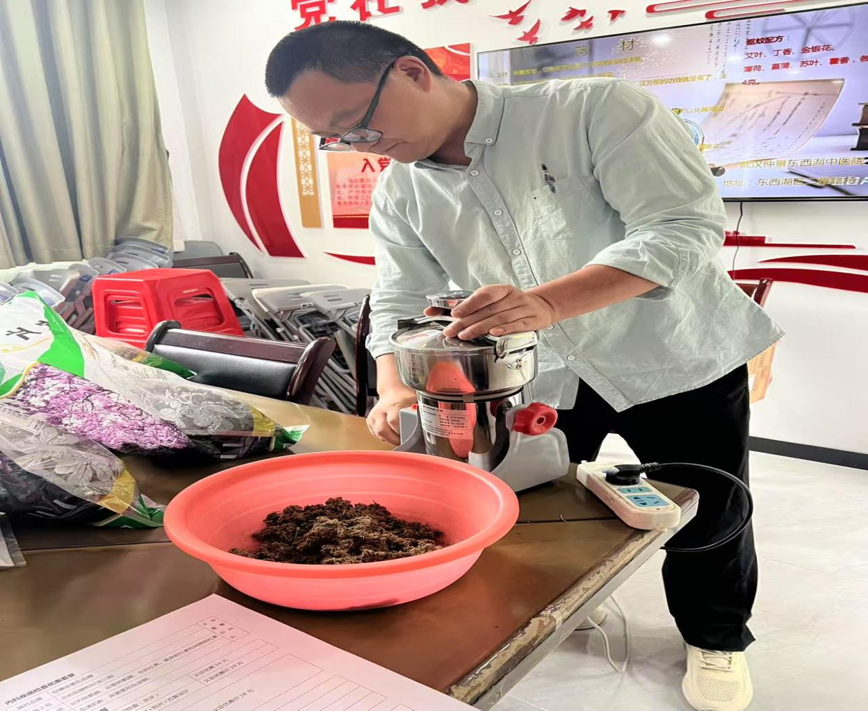 在药材讲解环节,医师逐一展示透明药罐中的艾叶、苍术、丁香、藿香、薄荷、白芷等药材。“大家看这株艾叶,叶片背面密布白色绒毛,揉碎后散发的挥发油对蚊虫有明显驱避作用;而苍术切片呈黄白色,它的挥发油成分能抑制细菌滋生。”制作环节开始前,工作人员用机器把药材打磨成粉,然后混合在一起。大家再把药材装入准备好的香囊里面。中药材的混合香气中,不时响起阵阵欢笑。