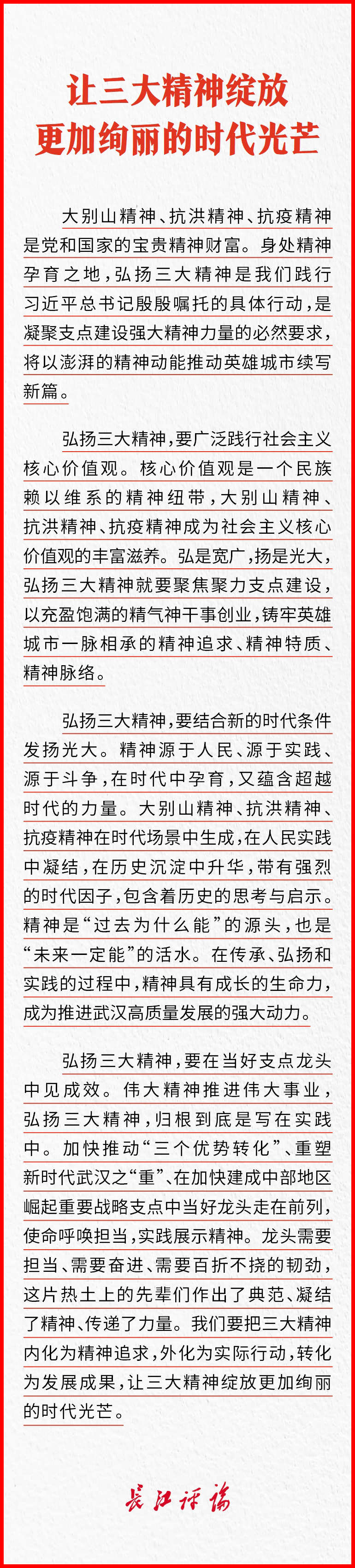 弘扬三大精神,连发三论! 2025-06-13 17:29 去年11月, 习近平总书记考察湖北时强调, 大力弘扬大别山精神、 抗洪精神、抗疫精神, 广泛践行社会主义核心价值观。 弘扬三大精神,奋力建成支点, 今年6月4日至6月6日, 长江日报连发三论。 ↓↓↓ 来源 - 长江日报 分享到