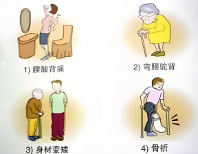 - 身高变矮(超过3cm)、驼背(椎体压缩骨折导致)。 - 轻微外力后骨折(如手腕、髋部、腰椎)。 - 慢性腰背疼痛,尤其是久站、久坐后加重。