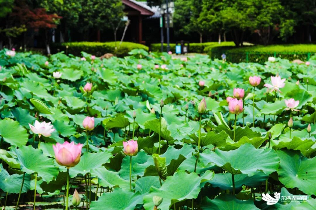 公园荷塘面积约2000平方米,分布在芙蓉园至彩叶林、楚园等地,有“碧莲”“太空莲”“凤戏牡丹”等10余个品种。进入公园大门后,沿左侧步道前行,穿过中式园林拱门,便走进雅致的花鸟水墨画世界。