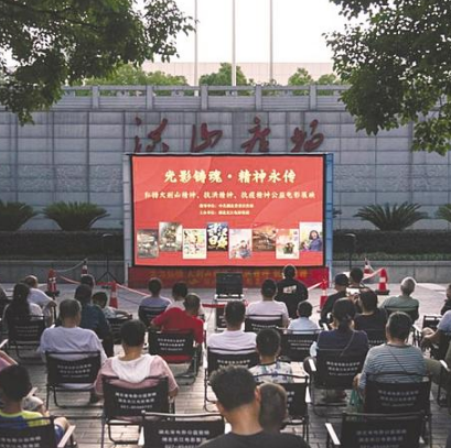 6月13日晚,武汉市洪山广场电影公益放映点,由省委宣传部指导,湖北长江电影集团主办的“光影铸魂·精神永传”弘扬三大精神公益电影展映活动与广大影迷见面。从6月初开始,我省举办三大精神主题电影进校园、进社区、进机关、进企业、进乡村、进广场等展映活动,计划年内开展1万场专题放映。(湖北日报全媒记者 文新 通讯员 张振华 王娟 摄)