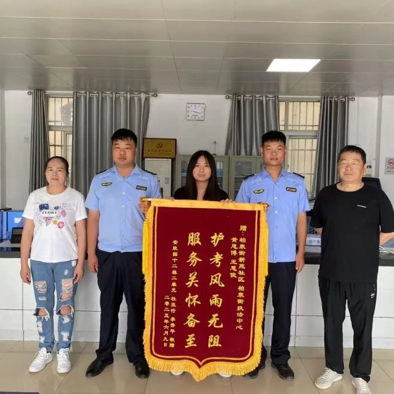 6月12日,一面印着“护考风雨无阻 服务关怀备至”字样的大红锦旗,被送到柏泉街综合执法中心。考生小杜及其家人满怀感激,将锦旗郑重交到执法队员王思俊和黄思博手中,以此表达对执法人员全程护送高考的诚挚谢意。