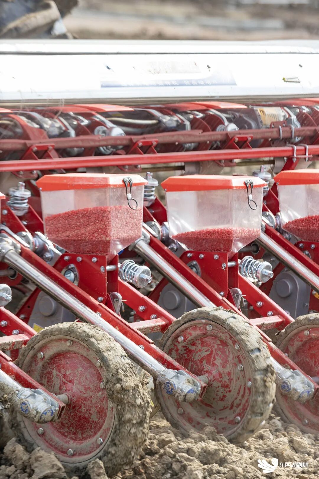 在农仓大田种植区,种肥同播一体机正高效作业。随着液压装置发出规律的“嗤嗤”声,精量播种系统飞速旋转,将包衣种子与肥料精准送入开沟器划出的泥缝中。