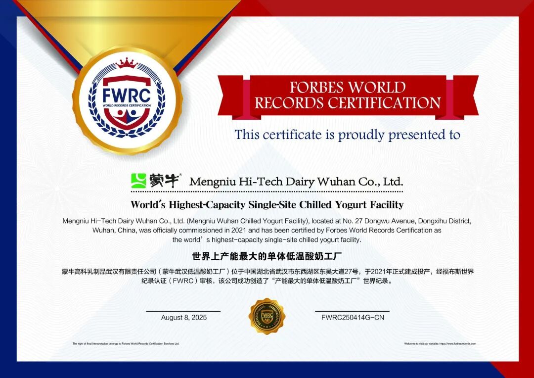 此次蒙牛低温(武汉)工厂荣膺“世界上产能最大的单体低温酸奶工厂”FWRC福布斯世界纪录认证,是国际权威官方机构对蒙牛世界级工厂科研实力与品质标准的权威见证,更是中国乳业整体智造水平跃升全球前列的有力证明。作为武汉市、东西湖区重点招商引资企业,蒙牛低温(武汉)工厂以切实行动为行业打造新质生产力作出了表率。