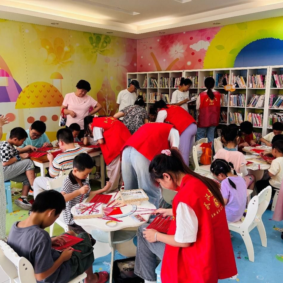 手工制作区域气氛热烈。孩子们以“爱我中华”“祖国万岁”“我爱中国”等为主题,用竹篾、画框等材料创作手工作品。不一会,一幅幅红色主题的竹编画在指尖成型。