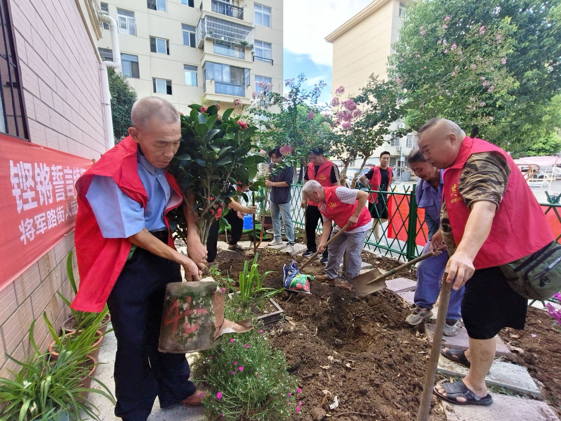 议事会刚落幕,“将军红”退役军人志愿者们便立即前往将军新村一期的共享花园开展植绿实践。铲土挖坑、扶苗培土、提水灌溉……大家分工协作,干劲十足,志愿红的身影在阳光下格外醒目。当选筹备组成员的李班长一边擦拭额头的汗水一边说:“议得再好不如实干一场,今天我们就用行动践行服务承诺!”