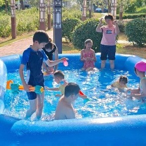 随着一声清脆的水声,茅庙集社区的充气泳池内,一场热闹的“水枪大战”正式拉开帷幕。孩子们手持各式“武器”——有的手持超大号水枪,霸气十足;有的则巧妙地将水枪藏在背后,出其不意;有的将脸盆、水桶盛水泼洒,水花飞溅中欢笑声、呐喊声此起彼伏,气氛热烈。