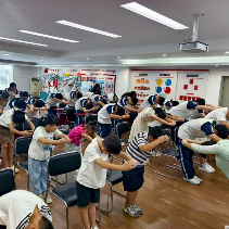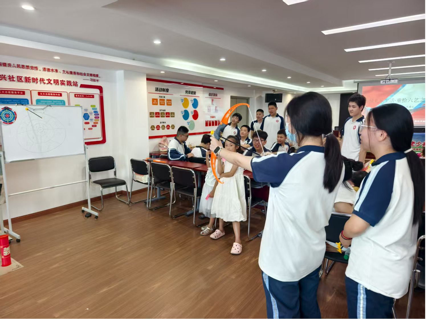 “右手在内,左手在外,交叉于胸前……”志愿者老师率先示范传统礼仪规范,“这不仅是见面时的礼仪,更是‘礼’文化中‘敬人者,人恒敬之’的体现。”老师的讲解让孩子们若有所思,纷纷挺直腰背模仿,稚嫩的动作里透着认真,现场很快被庄重的文化氛围包裹。随后的六艺知识讲堂上,社工结合动画短片讲解:“‘射’在古代不仅是射箭技艺,更讲究‘内志正,外体直’的修养;‘书’不只是写字,更是通过笔墨传递做人的风骨。”生动的解读让青少年对“礼、射、书”有了更鲜活的认知。