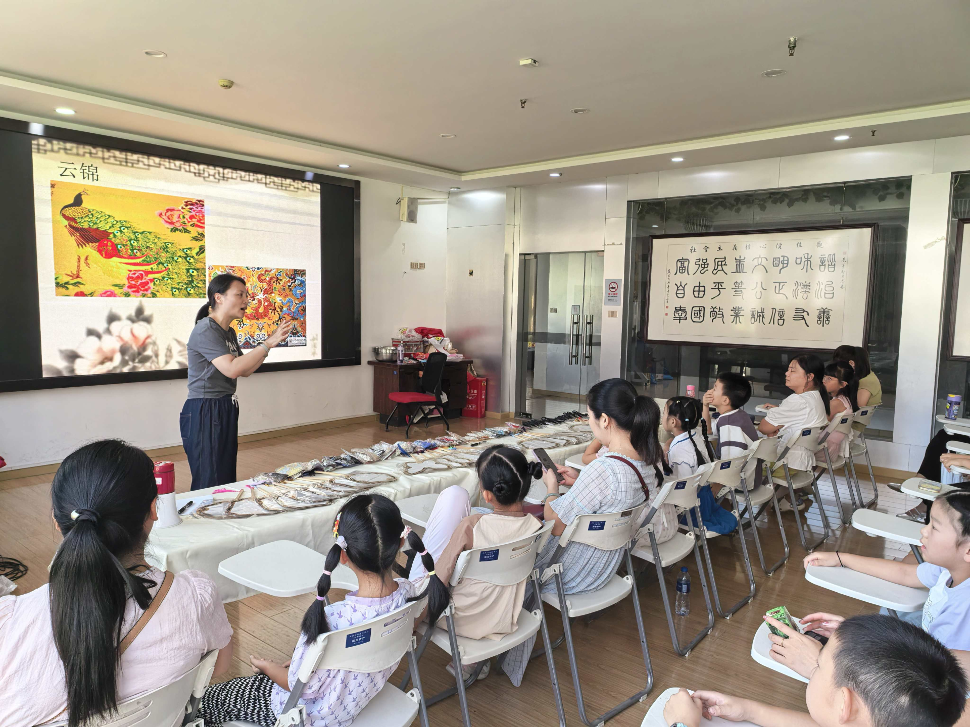 游戏过后,活动进入文化讲解环节。从 “宋锦的历史渊源”“织造工艺的复杂工序” 到 “纹样背后的吉祥寓意”,老师用通俗的语言逐步讲解。过程中,亲子家庭的互动从未间断,不少家长拿出手机,和孩子一起拍下 PPT 里的宋锦纹样细节,小声讨论 “这个云纹很精致,贴珍珠的时候可以围着它摆”。