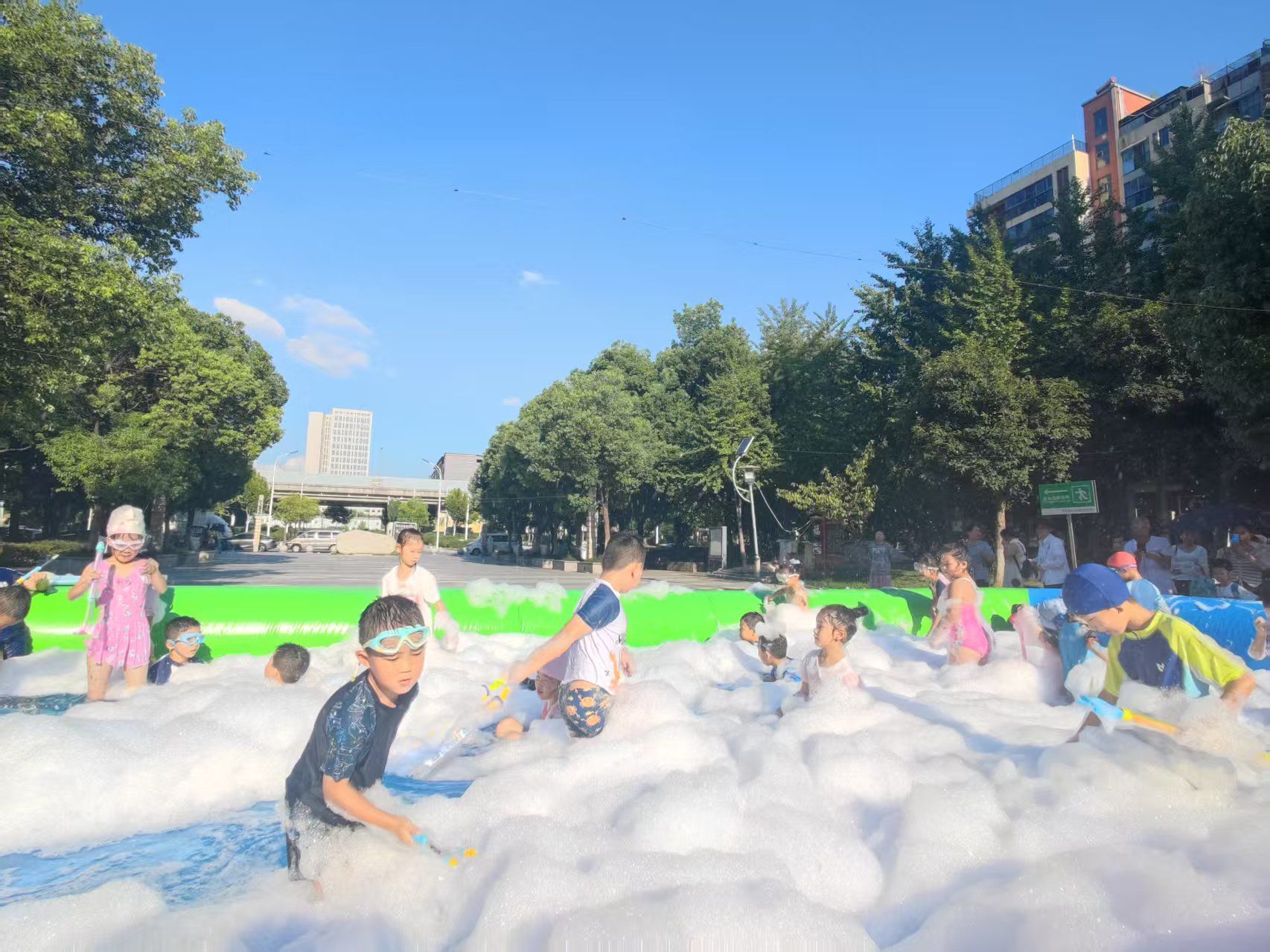 活动伊始,梦幻的“泡泡派对”瞬间点燃现场气氛。晶莹剔透的泡泡漫天飞舞,孩子们在泡泡海洋中追逐嬉戏,欢声笑语洋溢整个社区。精心设置的趣味游戏互动区也备受青睐,有效促进了亲子互动与邻里交流,增进了社区凝聚力。