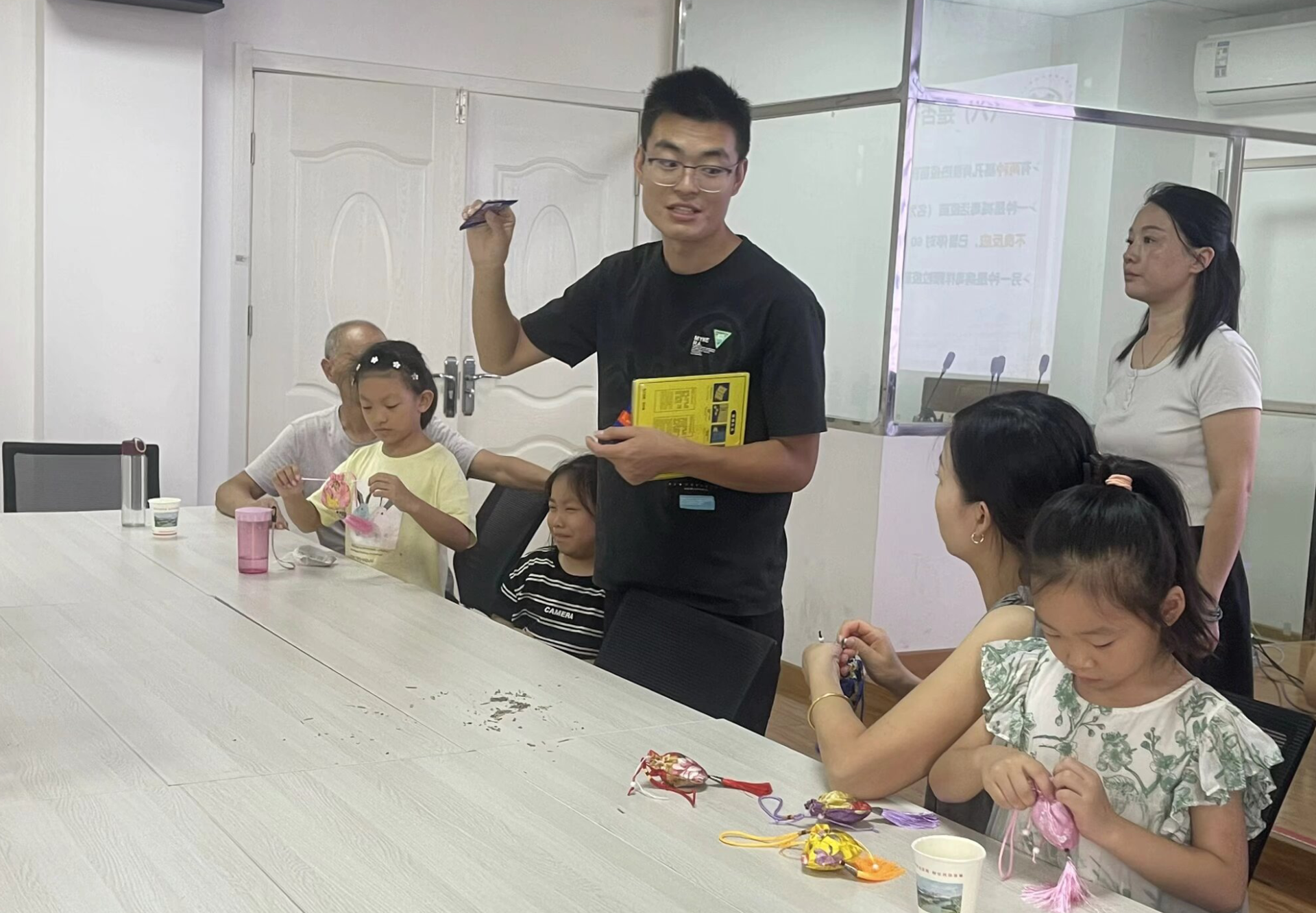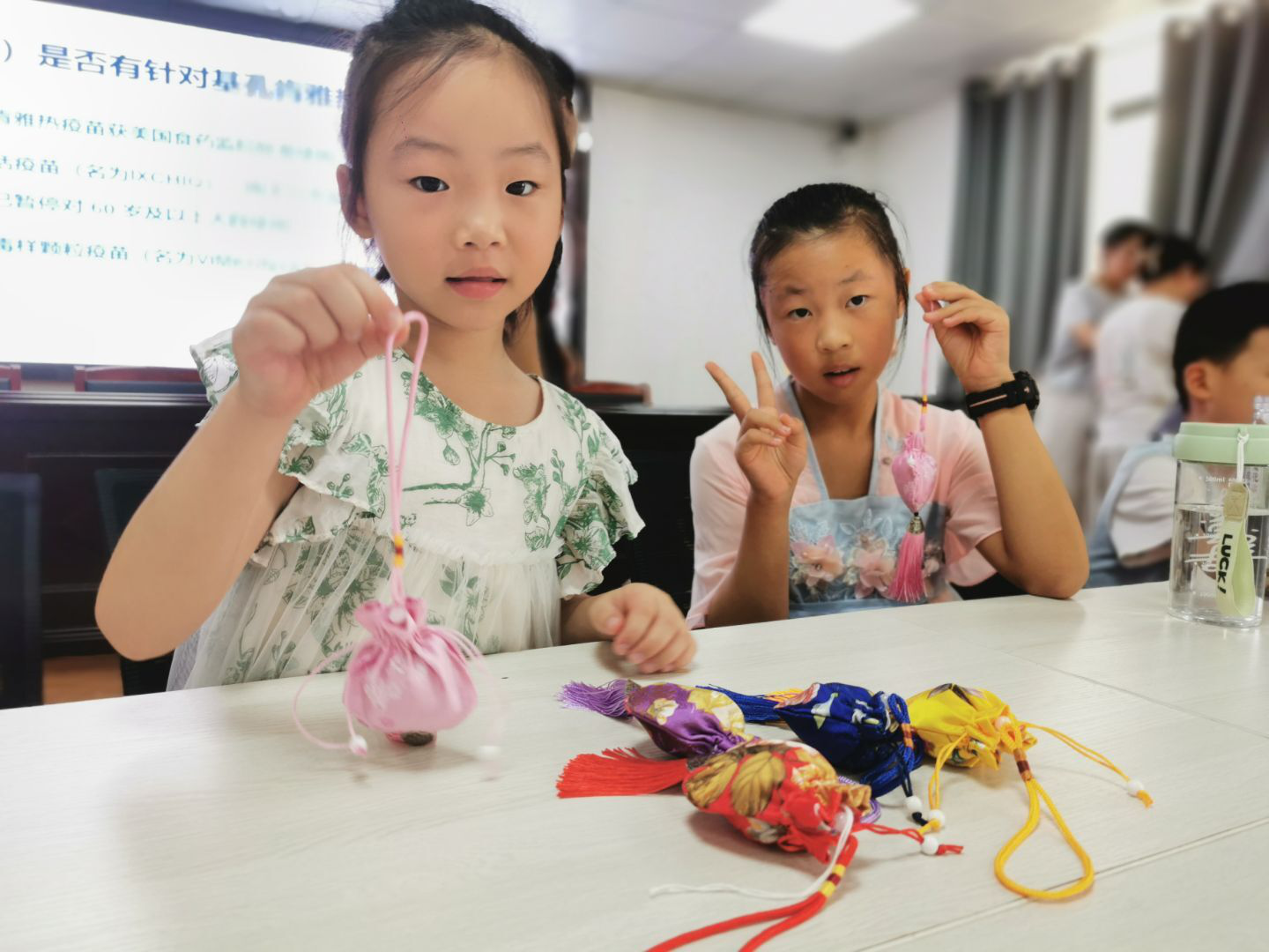讲座最后,有一个制作驱蚊手环和香囊的环节。老师一步一步演示制作过程,按步骤讲述制作香囊、手环的具体方法和操作要领。在老师的指导下,参与人员认真动手制作起来,不一会香囊和手环制作好了,大家看着自己做的“锦囊妙计”脸上露出了开心的笑容。