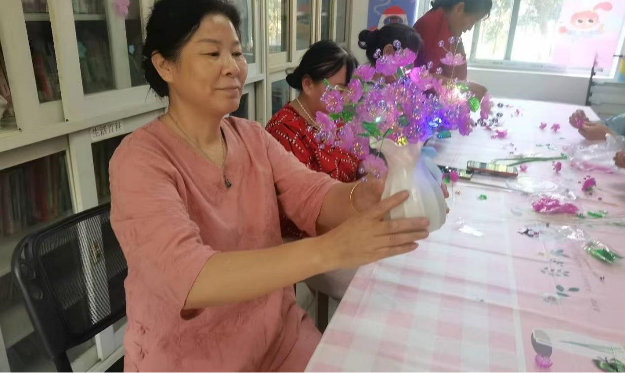只见几根细铜丝在居民们的巧手中逐渐凝成花茎,色彩斑斓的珠子化作花蕊,鲜艳的彩布则被巧妙地剪裁成花瓣。经过一番精心的组合与搭配,原本看似普通的材料瞬间焕发出新的生机,变成了一树栩栩如生的蜡梅、一束娇艳欲滴的玫瑰……居民们在实践中迅速掌握了串珠的技巧,将一颗颗五颜六色的水晶珠巧妙地串联成一件件精美的艺术品,充分感受到了手工制作的独特魅力。