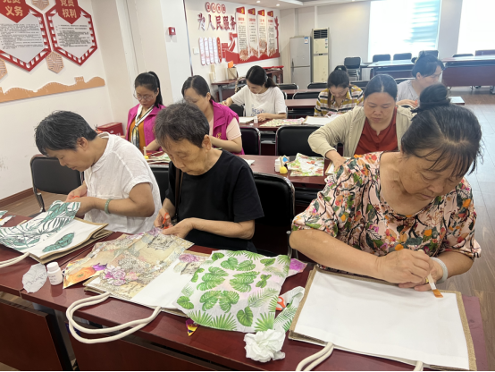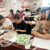老师的细致指导让初次接触该工艺的姐妹们放下顾虑,迅速投入到创作中。年轻妈妈吴女士挑选出女儿最爱的桔子图案,仔细裁剪粘贴后点缀绿叶,让布包满是童趣;胡阿姨偏爱复古风,用几何图形与花朵图案拼贴出个性设计,还不时和邻里交流创作思路......活动尾声,一个个独具特色的手工包新鲜出炉,花鸟蝴蝶、卡通形象、简约纹样各异,承载着大家的创意与热爱。