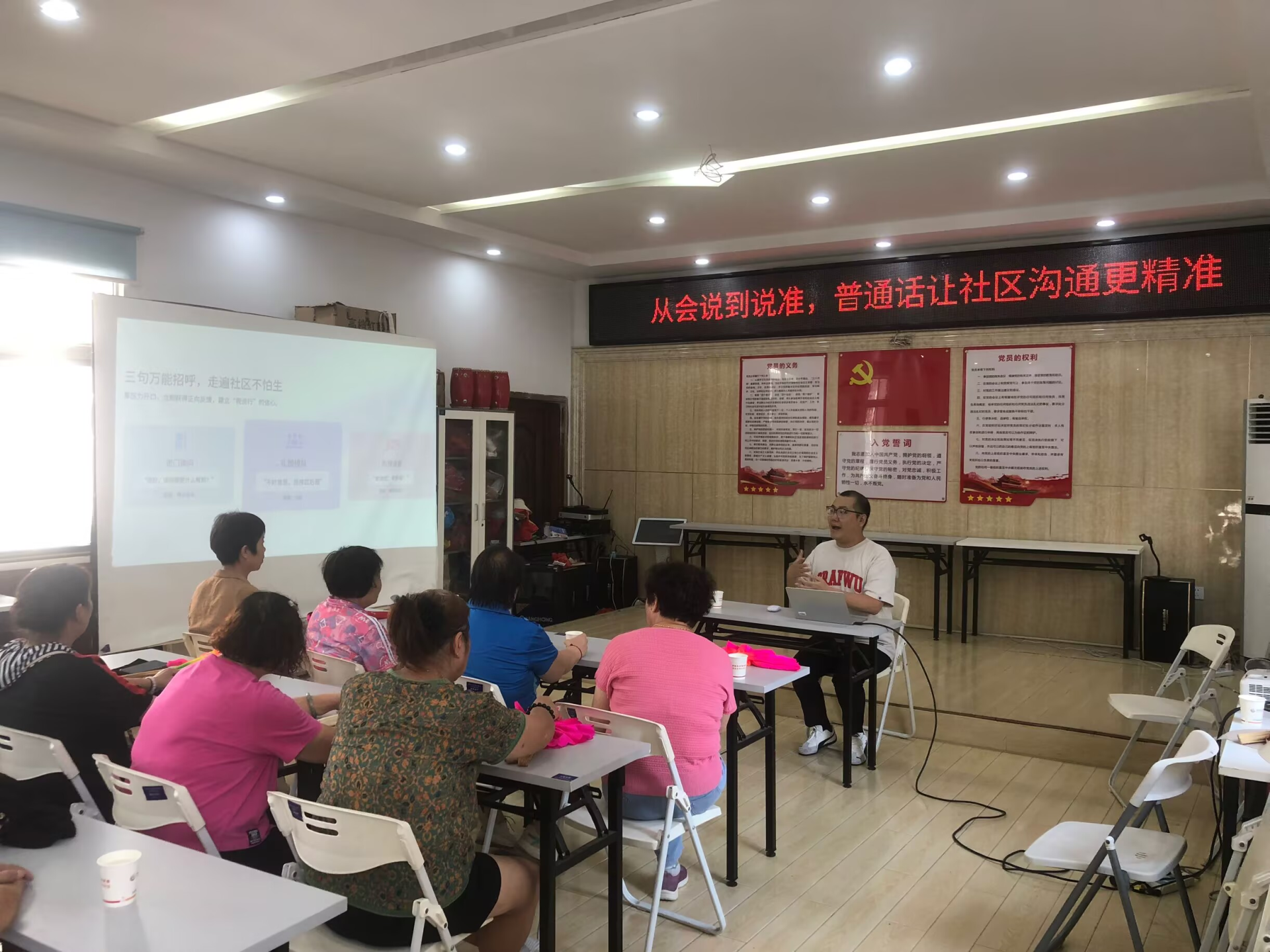 讲座现场,讲师结合社区生活常见场景,以“物业通知误解”“业务办理沟通偏差”等真实案例切入,讲解普通话发音要点与规范表达技巧,重点覆盖日常问候、政策咨询、邻里互助等高频交流场景。同时设置互动问答环节,针对居民提出的“方言口音难纠正”“特定词汇不会说”等问题逐一解答,还通过分组情景模拟,帮助居民实操练习精准表达。