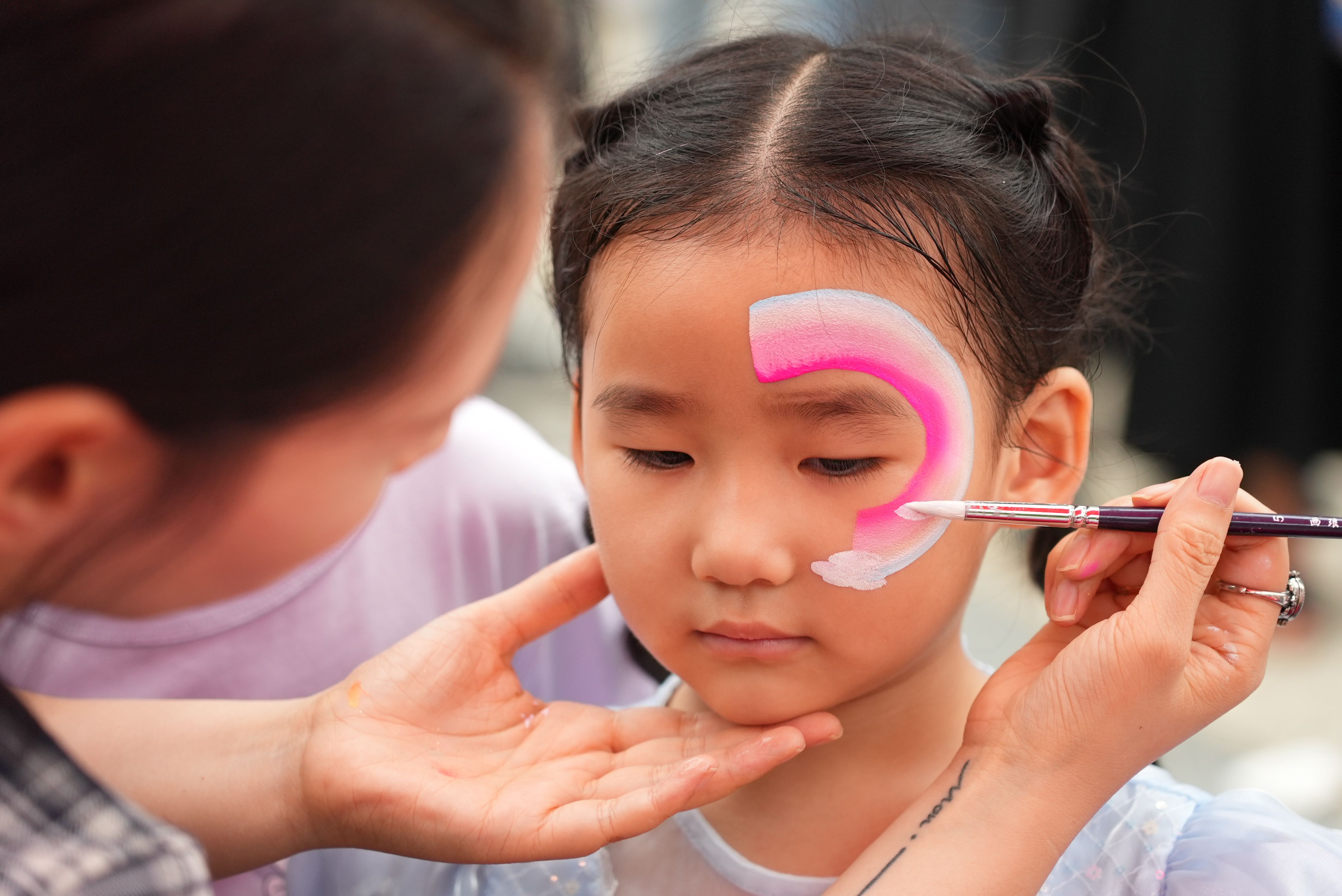 “今天现场好多好玩的,我玩得很开心,还画了彩绘。吃了火腿肠、汉堡和鸡腿。”活动现场,画完彩绘后的安安和小伙伴们开心地玩了起来。