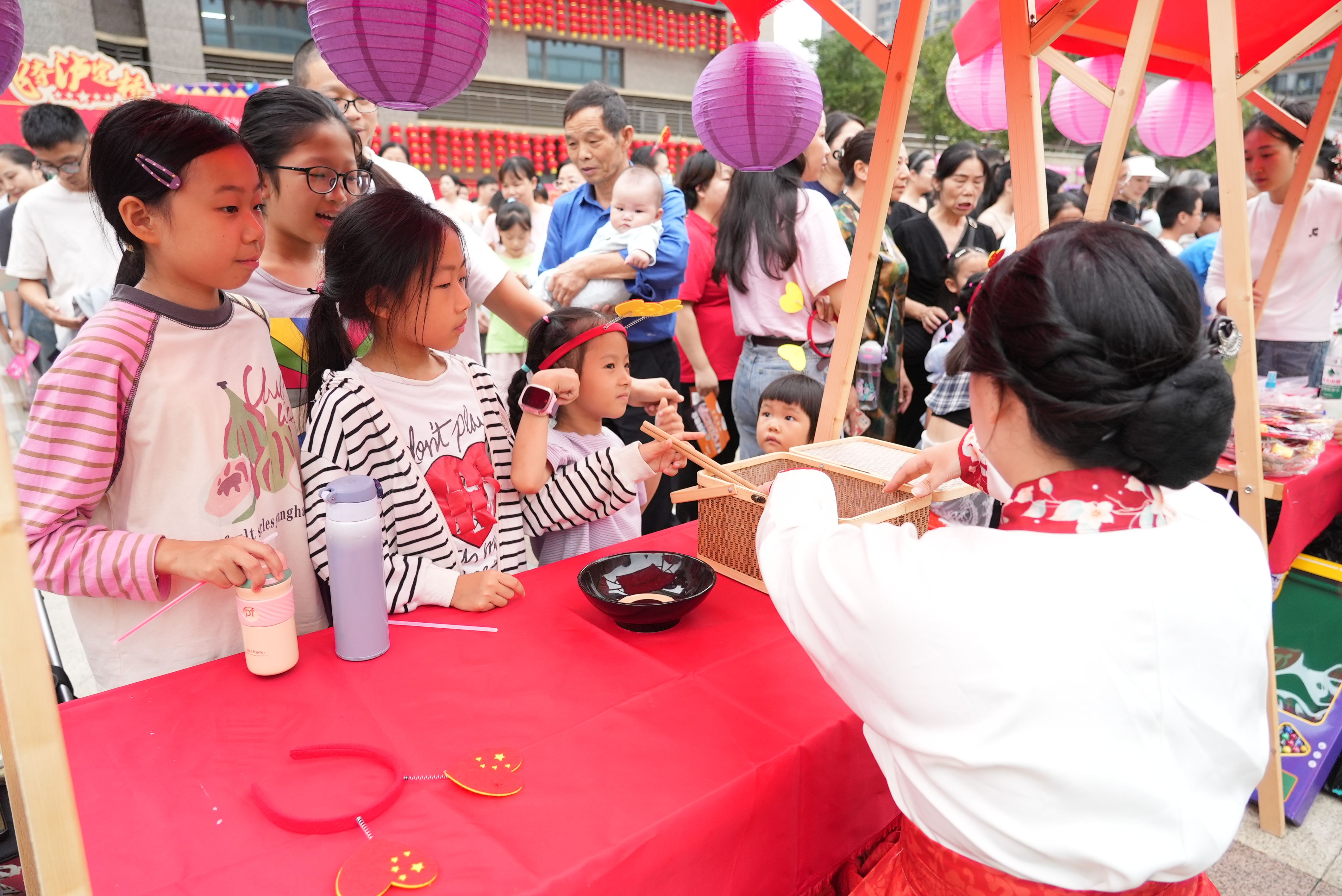 活动现场人潮涌动,气氛热烈。做香囊、投壶、制漆扇、古装体验、串手链、丢沙包、DIY风筝、滚滚乐、贴花钿、品花茶、尝爆米花和烤肠……十余个特色摊位前人头攒动,被热情的居民们围得里三层外三层。空气中弥漫着艾草的清香、烤肠的焦香与爆米花的甜香,交织成令人愉悦的节日气息,吸一口便觉满心欢喜。