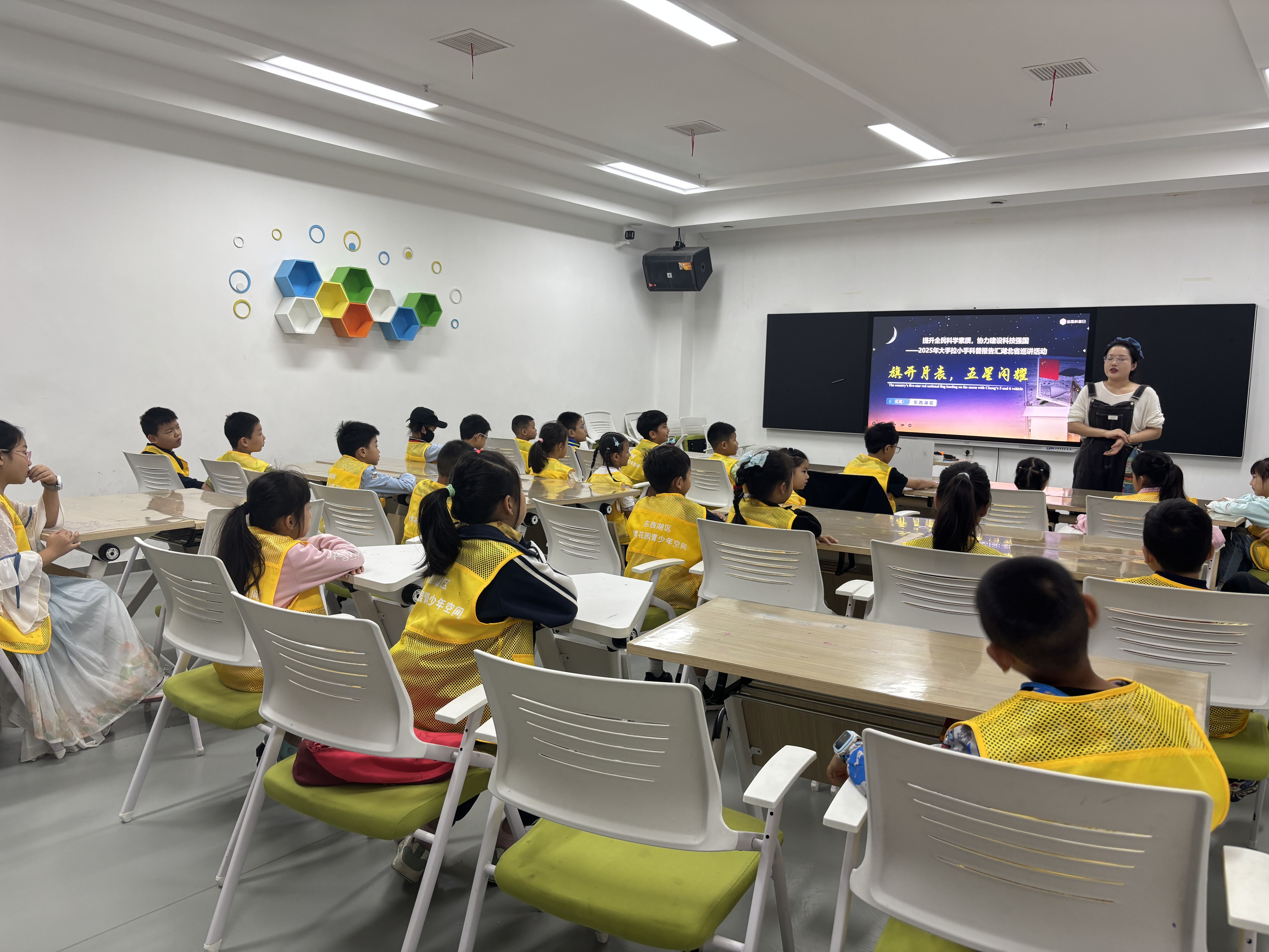 当话题转向“武汉造”的嫦娥六号月背五星红旗时,现场气氛达到高潮。老师介绍,这面特殊的红旗采用玄武岩石头拉丝纺织而成,是人类目前首创的航天材料,其耐高温、抗辐射的特性完美适应月球极端环境。“原来我们武汉的科技这么厉害!”听到这面“月球红旗”诞生于本地,不少青少年难掩自豪,对航天科技的好奇心与探索欲被进一步激发。