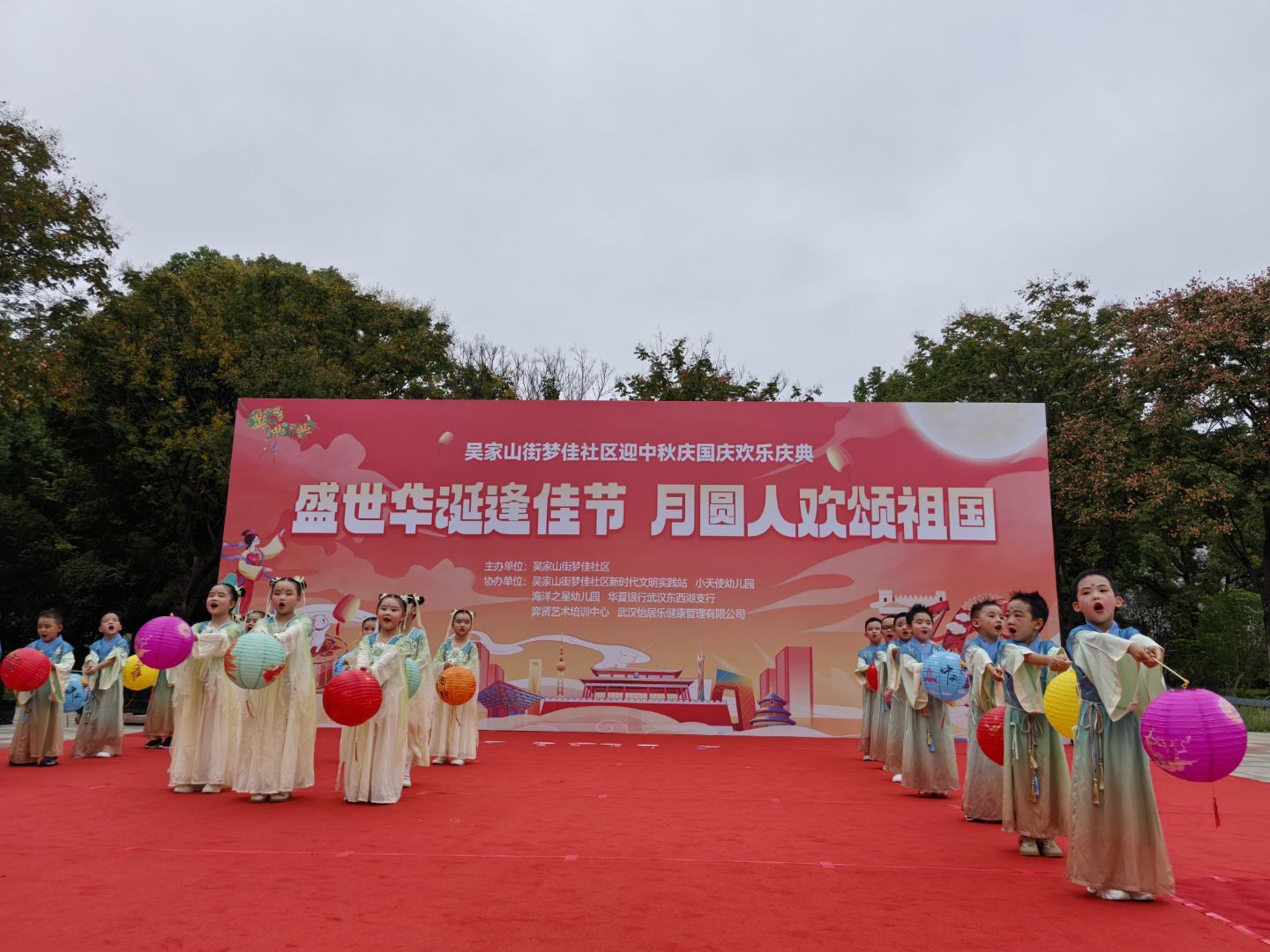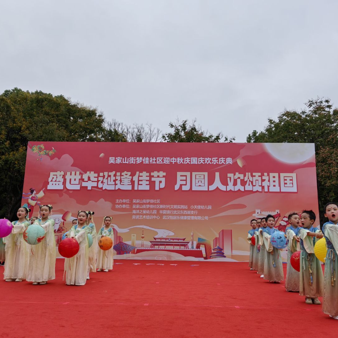 为弘扬爱国主义精神,营造热烈祥和的节日氛围,抒发社区居民的爱国情怀,梦佳社区联合吴家山街社区戒毒康复中心、小天使幼儿园、海洋之星幼儿园、华夏银行武汉东西湖区支行、怡居乐健康管理有限公司、弈贤艺术培训中心于9月26日在金山游园广场举办“盛世华诞逢佳节,月圆人欢颂祖国”文艺演出活动,辖区居民欢聚一堂,用歌声与舞姿为祖国献礼。