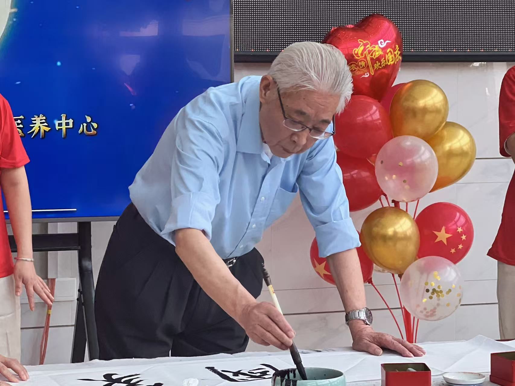 书法展示区墨香四溢,老年学校书法爱好者黄承林先生现场挥毫,写下“家国团圆”四个苍劲有力的大字,并赠予长者代表。台下家属们的参与同样热烈,他们或记录精彩瞬间,或鼓掌喝彩。李怀家属登台献唱《静静地黄昏》,赵爷爷女儿一曲京韵十足的《前门情思大碗茶》,字正腔圆的唱腔赢得满堂彩,连京剧爱好者张爷爷都竖起大拇指:“这京剧唱得地道!”。