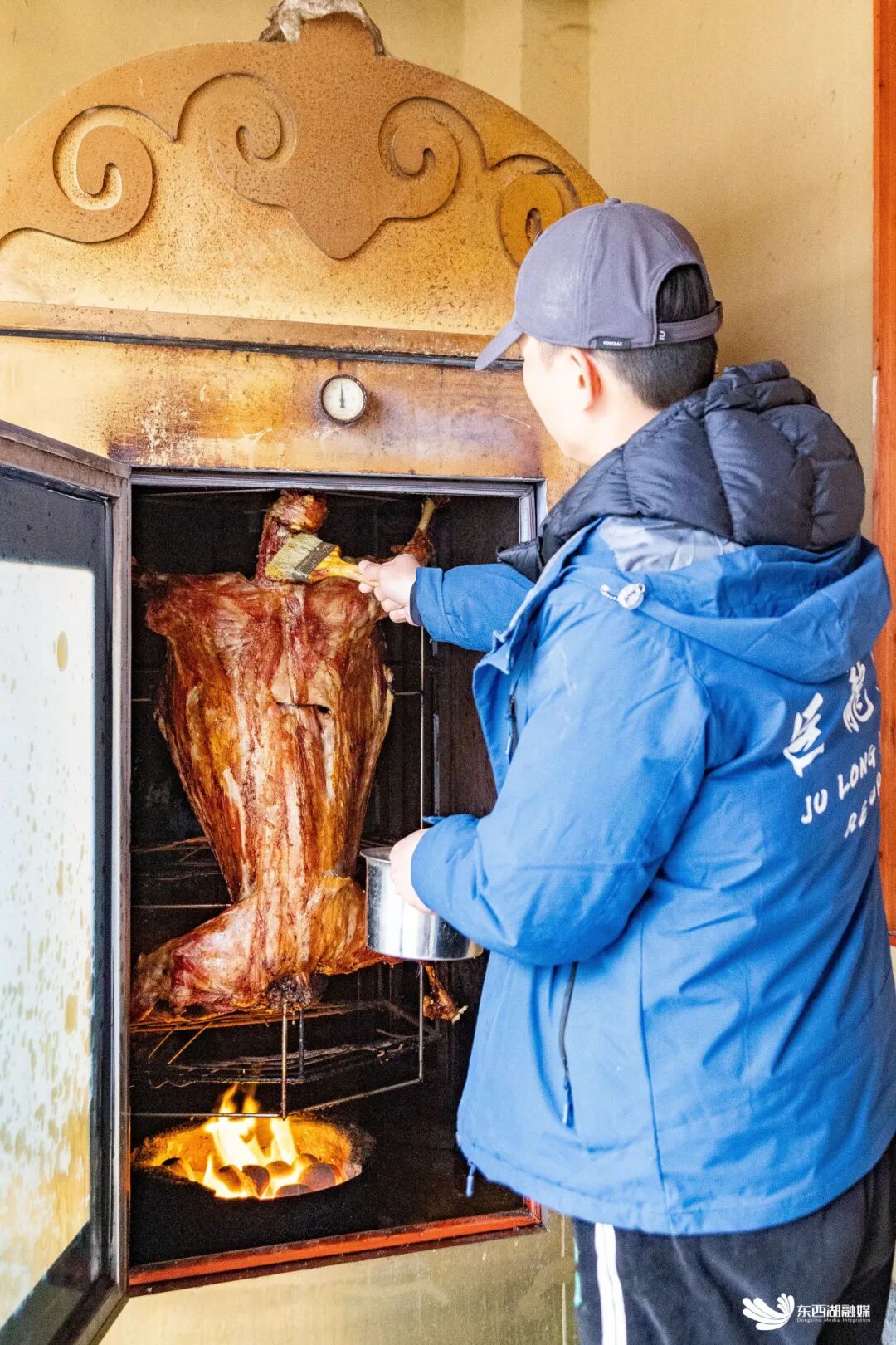 果木烤全羊,羊肉裹着秘制酱汁慢烤数小时,外皮酥脆、肉质鲜嫩,是秋日滋补的绝佳选择。(需提前一天预订。)