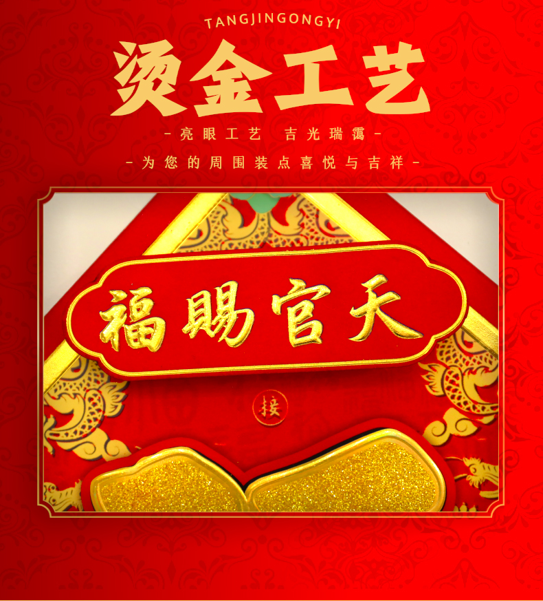 产品以中国红为基底,辅以烫金工艺,中间是立体的“福”字,两侧则是门神形象,整体设计大气精致。其中,中国红寓意红红火火、蒸蒸日上,饱满的立体“福”字则象征着福气满满。