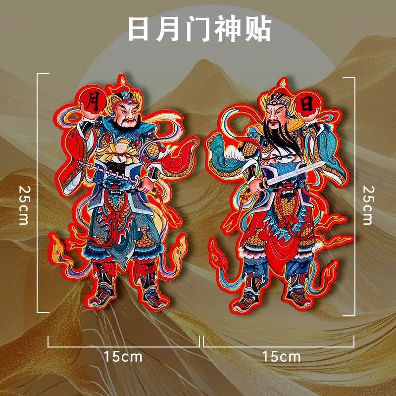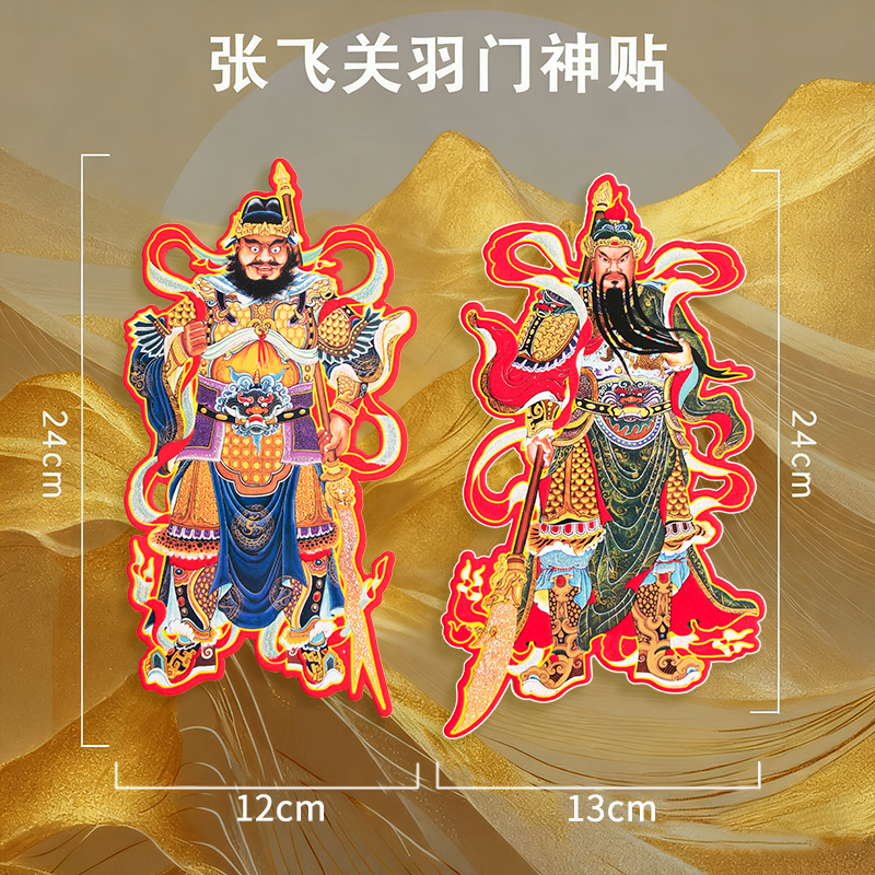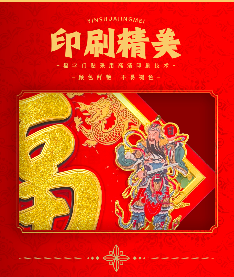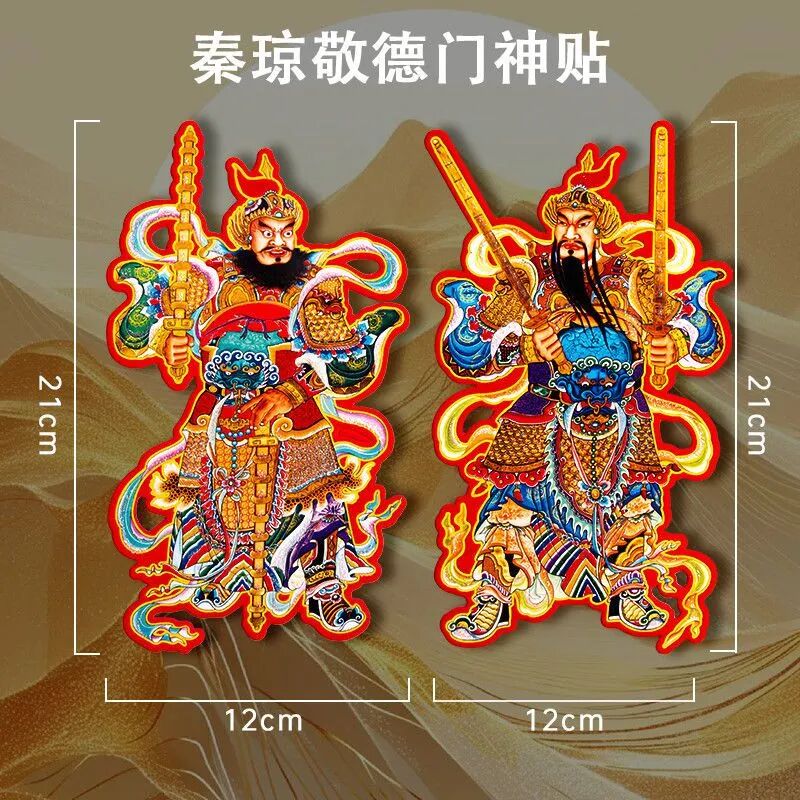 该产品将秦琼、敬德等传统门神形象以生动的方式呈现出来。色彩鲜艳饱满,笔触细腻,门神的每一根胡须都清晰可见。其神态威严,不怒自威,传统韵味与现代审美结合得恰到好处。此外,产品制作工艺精湛,还融入了植绒、烫金等工艺,进一步提升了产品的质感和美观度。