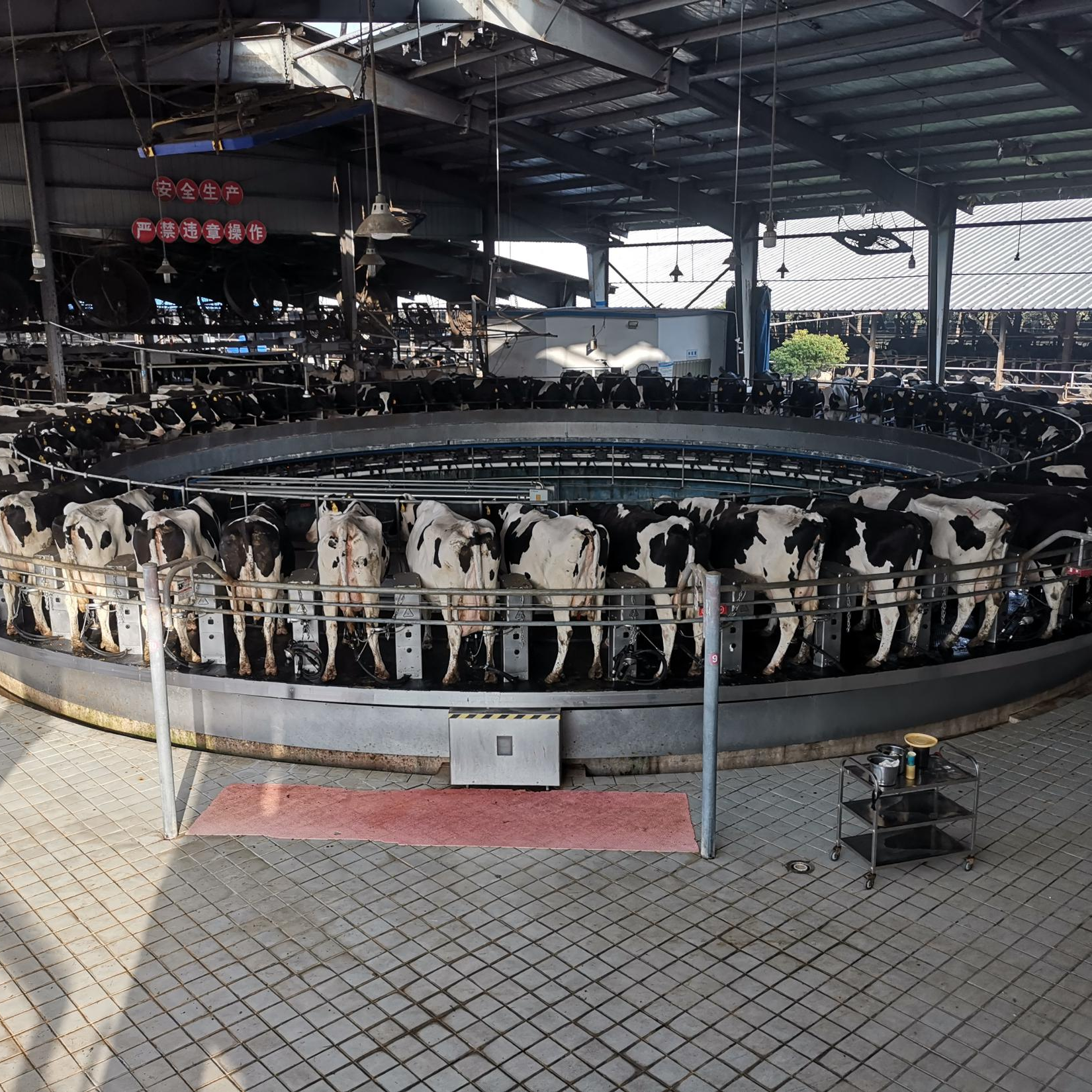 清晨六点,牧场挤奶厅已有序运转,奶牛依次登上转盘式挤奶机,耳边佩戴的电子耳标被自动扫描识别相关数据实时上传至管理系统。