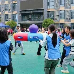 在“雷霆战鼓”比赛区,八个队员紧握绳索,目光紧紧追随着空中跃动的排球。“一、二、三!”队员们齐声呼喊,默契配合,让排球在鼓面上欢快跳跃。每当排球高高弹起,现场便爆发出阵阵喝彩;偶尔失误,队员们也毫不气馁,互相打气后立即重新投入比赛。