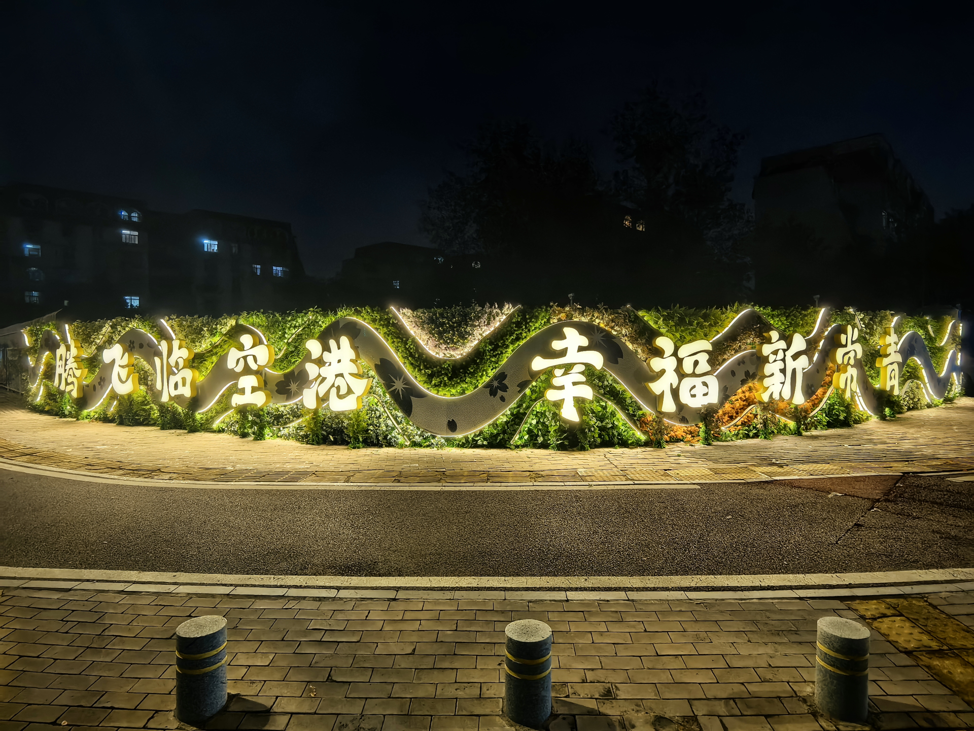 此外,施工人员对42.9平方米的墙体进行加固修复,彻底消除结构隐患。随后以仿真花卉点缀墙面,增添生机与艺术感。最引人瞩目的是墙面上“腾飞临空港,幸福新常青”的醒目字样,展现着区域的发展活力。字体周边镶嵌的金色灯带在夜晚化身一盏盏静静守候的路灯,用柔和而温暖的光线,为居民的回家之路点亮安心与陪伴。
