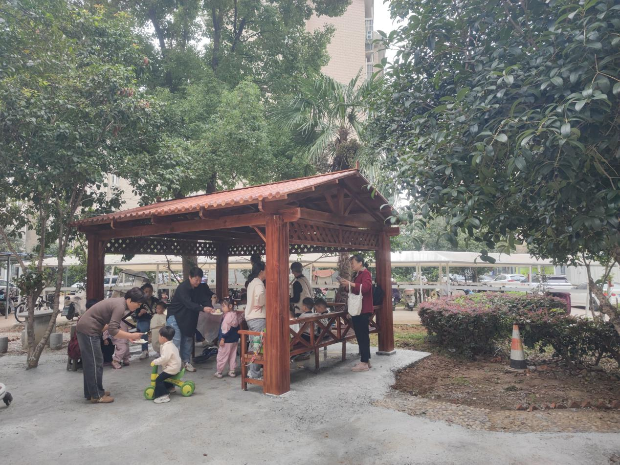 西湖名都小区因体量较小,仅有十栋楼宇,小区内部的公共活动空间和配套设施较为短缺,这一情况长期以来受到居民关注。怡景社区党委秉持“民有所呼、我有所应”的理念,组织工作人员深入小区居民家中走访调研,认真倾听大家的诉求与想法,同时联合物业、居民代表等多方力量,多次对小区内可利用空间进行实地考察、综合评估,经过不懈努力,终于落成启用,这个木质结构的议事亭,设计精巧且充满人文气息,既为居民提供了一处遮风挡雨的休闲场所,更搭建起邻里交流、社区议事的温馨平台。