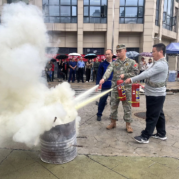 最让大家感到“实战”氛围的莫过于模拟火点扑救环节。面对熊熊燃烧的模拟火点,消防员详细讲解了干粉灭火器的“提、拔、握、压”四字使用口诀。随后,在确保绝对安全的前提下,社区民兵连、商户代表、物业及居民轮流上阵,手持灭火器对准火焰根部进行喷射。一时间,白色的干粉弥漫,一团团火焰被成功扑灭,现场响起阵阵掌声。亲手扑灭“火灾”的成就感,让抽象的消防安全知识转化为了深刻的肌肉记忆。