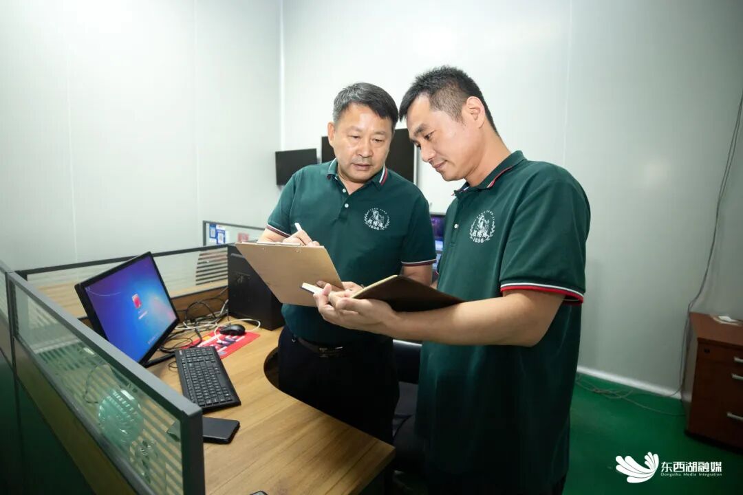 程雄斌(左)查看产销进度。
