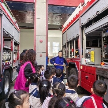 活动于上午9:30正式开始。在消防员和教师的共同组织下,孩子们有序进入消防站,首先参观各类消防车辆。消防员细致讲解云梯车、水罐车、抢险救援车等不同车辆的功能特点,并引导幼儿近距离观察随车器材,帮助孩子们初步建立对消防装备的认知。