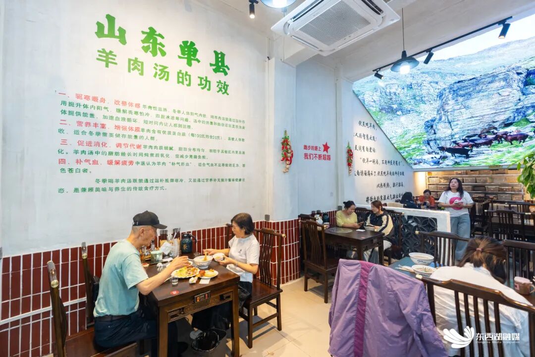 店内,是特色的山东农村式装修风格,土坯墙、木桌椅,墙上印有羊肉汤简介,服务员们扎着头巾、穿着碎花围裙,活脱脱“山东大嫂”的模样。桌上摆着三样“灵魂伴侣”:单县米醋、现磨胡椒、自制油辣子,食客们根据口味调配,酸香、椒香、辣香各取所爱。