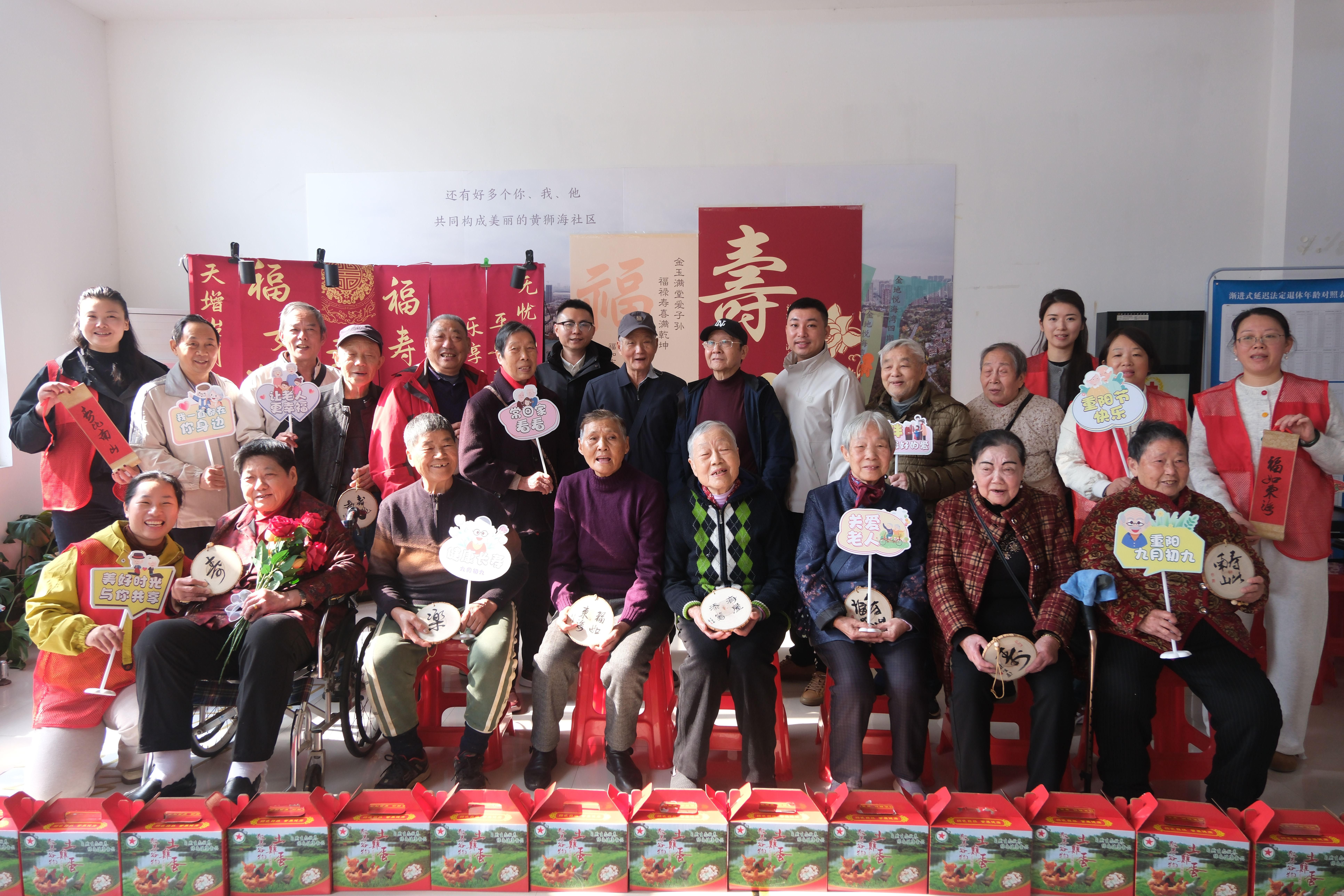 岁岁重阳暖,敬老情更浓。10月28日上午,黄狮海社区一楼大厅暖意融融,一场以“情暖金秋爱在黄狮海”为主题的祝寿活动在此举行,17位2025年下半年满80周岁的社区老人欢聚一堂,共庆生辰、共享温情。