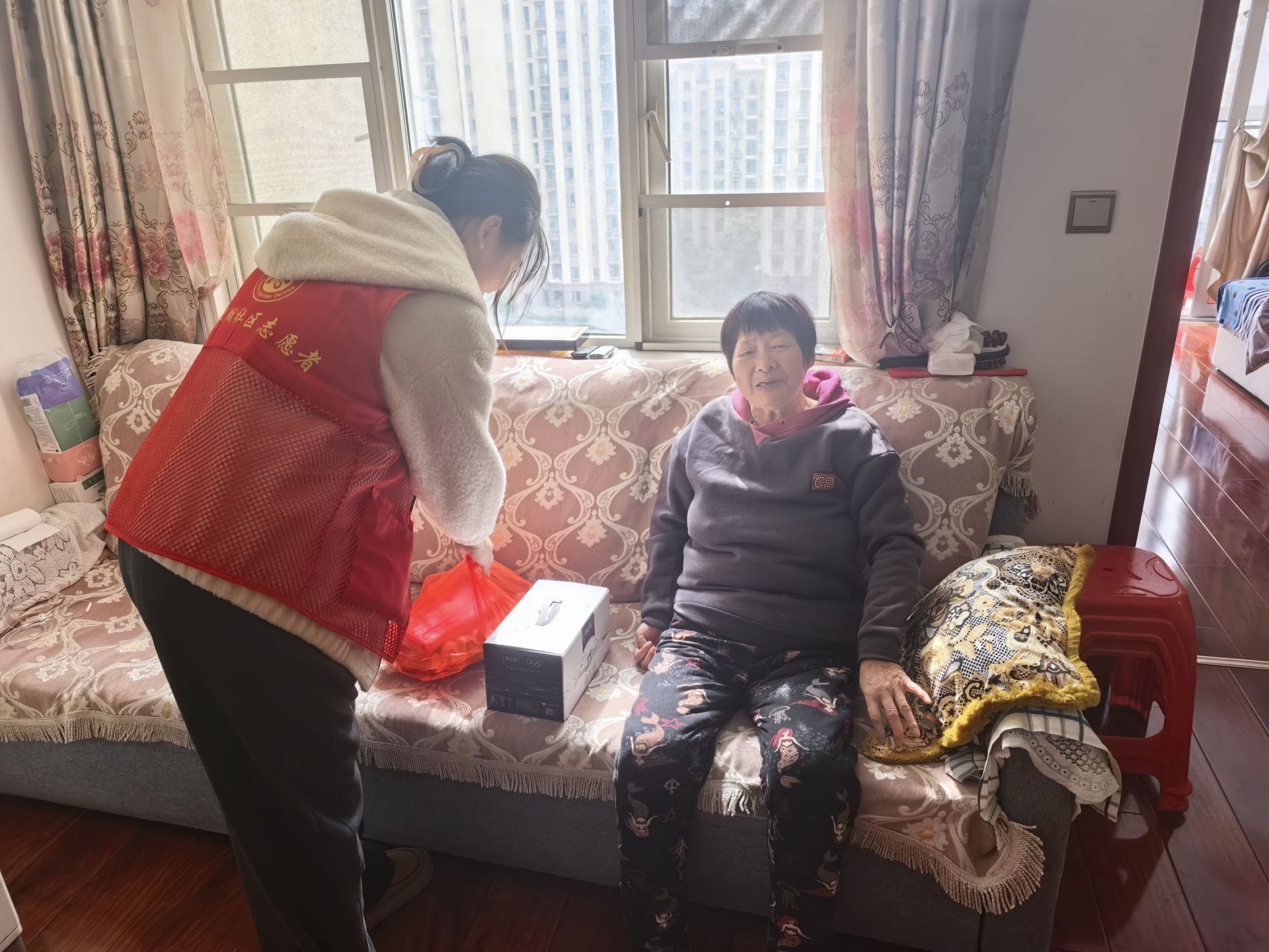 集体庆祝活动结束后,社区的关爱行动并未止步。由社区书记带队,社区工作人员和志愿者组成的关怀小组,带着鸡蛋、面、牛奶等物品,深入走访了辖区内的特殊老人。首先来到了80岁高龄的独居老人王奶奶家中。社区书记胡娜紧紧握住老人的手,与她亲切拉家常,仔细询问她的身体状况和日常生活情况,叮嘱她近日天气转凉,一定要注意保暖,保重身体。老人激动地说:“谢谢社区总是惦记着我,让我觉得一点也不孤单!”随后,又去看望了长期卧病在床的张大爷。社区工作人员详细了解了他的病情和康复情况,鼓励他保持乐观心态,积极配合治疗,并嘱咐家属有困难随时向社区反映,社区将竭尽全力提供帮助。