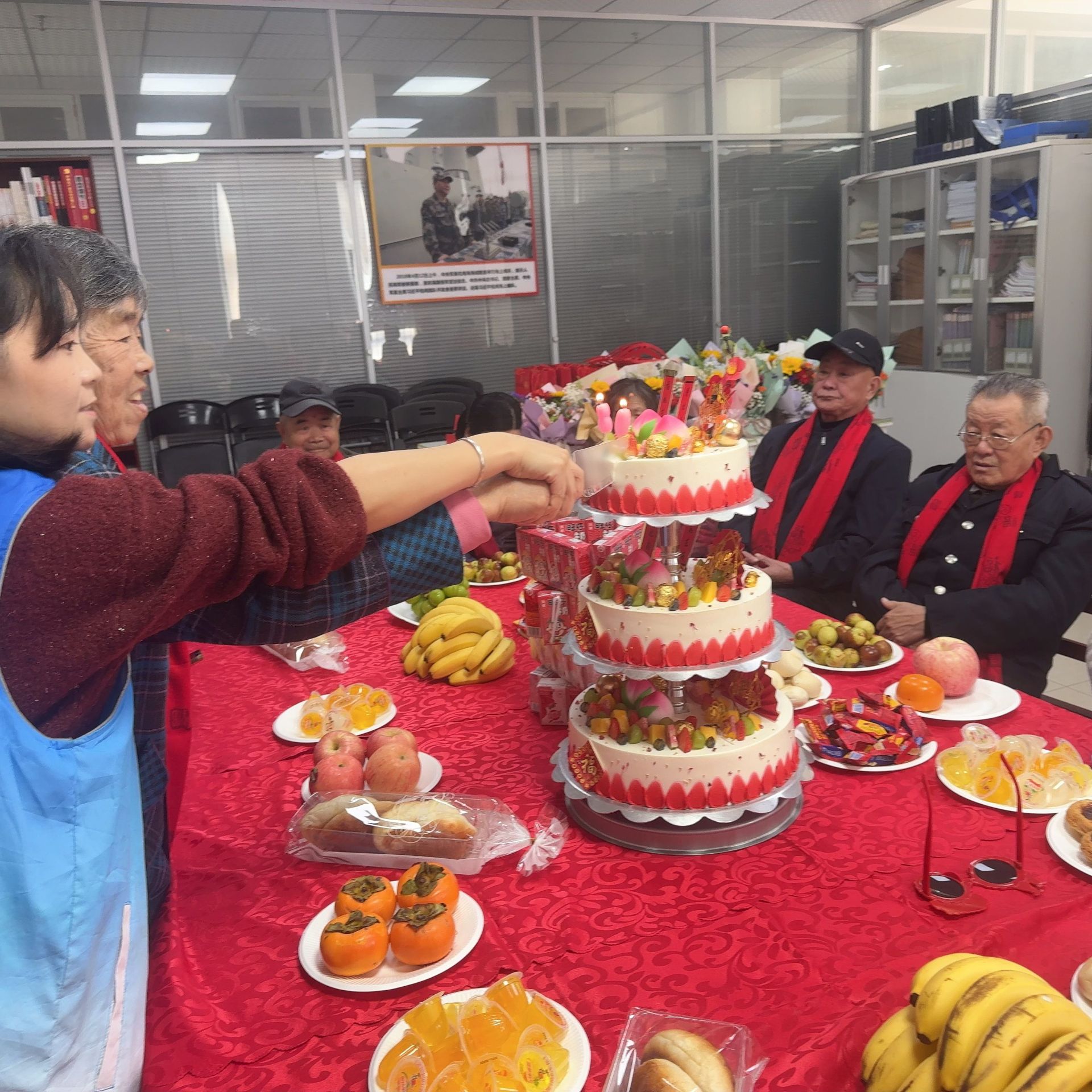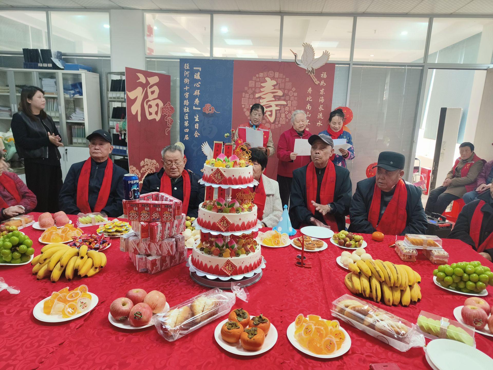 早上八点半起,老人们在家人的陪伴下陆续抵达社区。工作人员为寿星们佩戴上喜庆的红围巾,引导入座。活动现场布置得喜庆温馨,长条桌上,一个精美的三层生日蛋糕静立中央,四周摆满了各色新鲜水果、精致糕点和可口小吃,琳琅满目,香气四溢,处处洋溢着家一般的温暖与甜蜜。