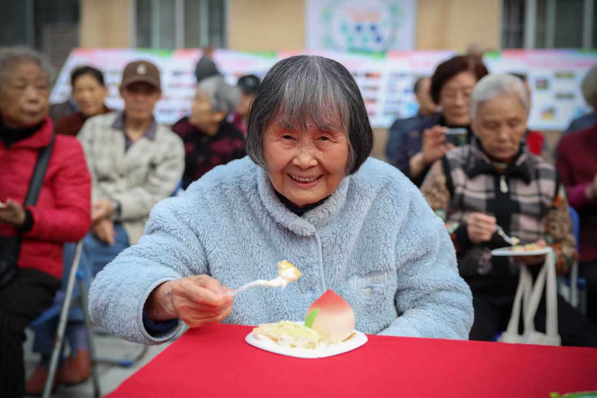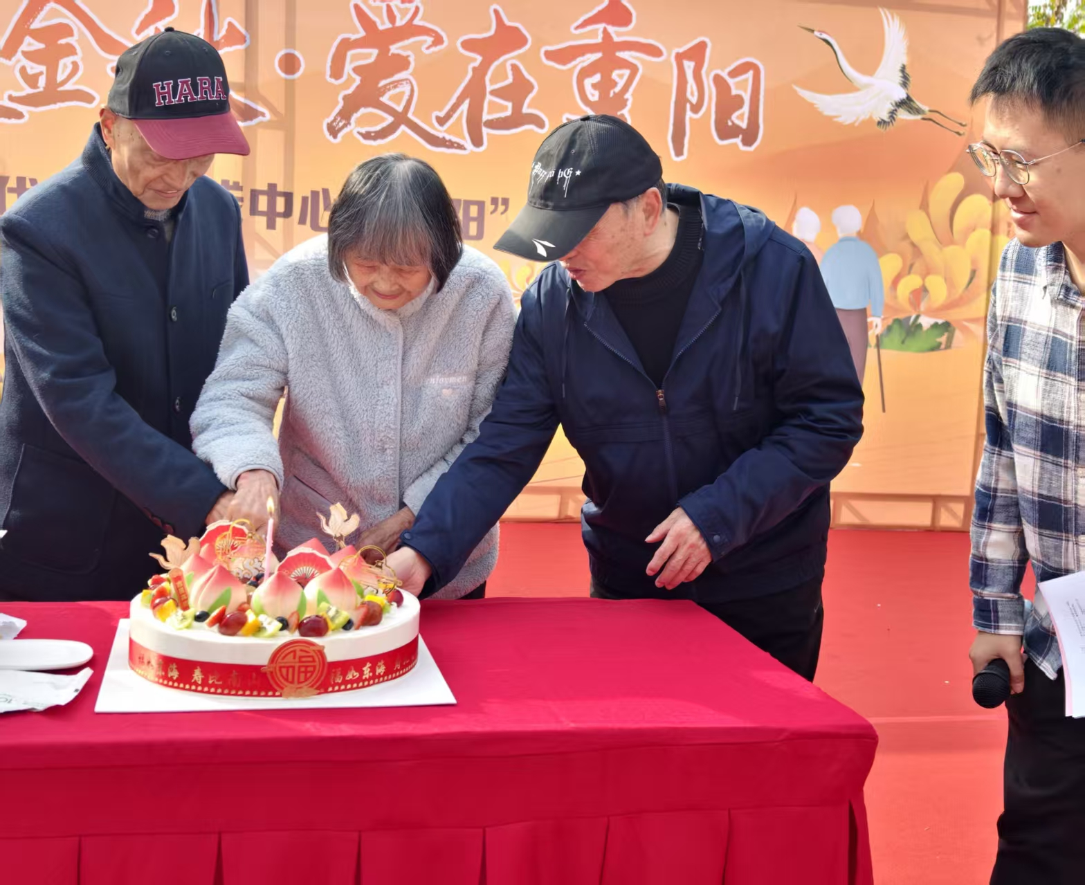 最令人动容的环节莫过于“重阳甜蜜礼”的到来。当一块缀着粉嘟嘟寿桃、写着“福如东海、寿比南山”的大蛋糕被推上舞台中央时,全场响起热烈的掌声。社区特别邀请了10月份过生日的姚显运、熊玉光、陈继勋三位长者上台,与大家一起分享这份喜悦。随着《生日快乐歌》的旋律响起,全场齐声合唱,整个广场顿时变成了温馨的生日派对现场。